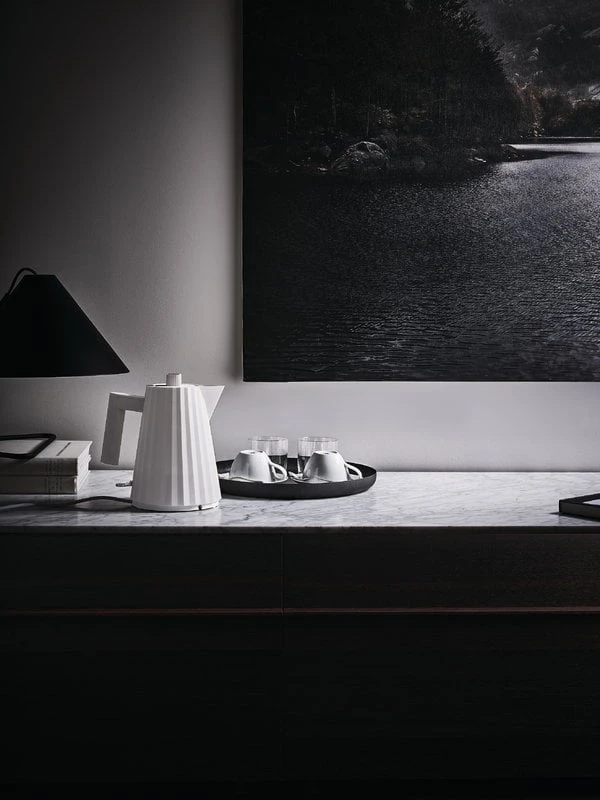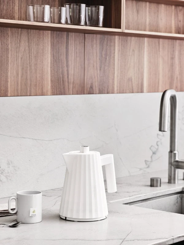 The Plissé kettle by Alessi was inspired by the worlds of fashion and architecture. Its three-dimensional surface resembles pleated fabric, and it has a dynamic, sculptural silhouette. Designed by Michele De Lucchi in 2018, Plissé is perfect for both boiling and serving hot water – thanks to the thermally insulated base, you can safely place the kettle on any tabletop. The kettle is equipped with an anti-limescale filter and a safety switch that automatically cuts off the power if there is not enough water inside. The heating element is hidden in the base for easier cleaning.